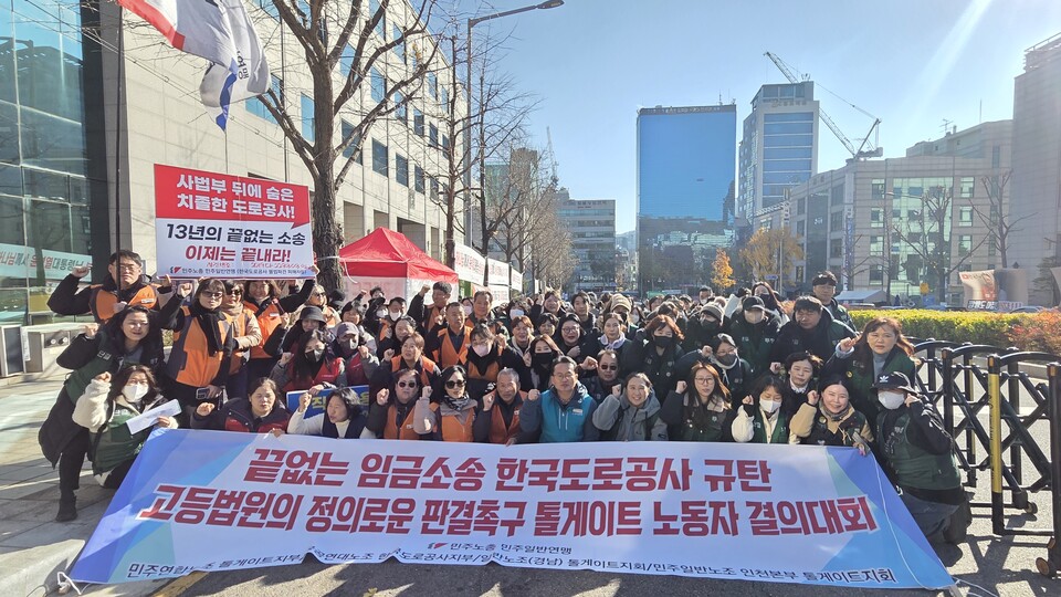 11.28. 톨게이트 노동자 결의대회 서울 중앙지방법원 앞에서 '끝없는 임금소송 한국도로공사 규탄, 고등법원의 정의로운 판결 촉구 톨게이트 노동자 결의대회'를 진행했습니다. |