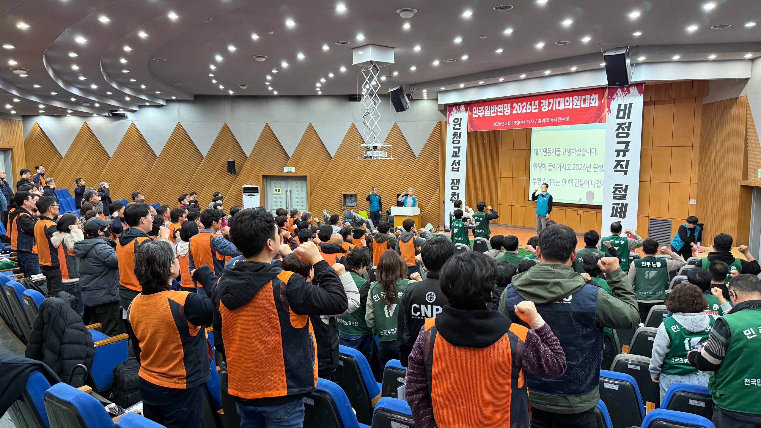 3월, 민주일반연맹은 한 해의 흐름을 정리하고 다음을 준비했습니다. 대의원대회를 통해 2025년 사업평가와 2026년 사업계획, 예산안을 승인했습니다. 또한 노조법 개정에 맞춰 기자회견과 실무 워크숍, 결의대회 등에 참여하며 원청교섭 쟁취 투쟁을 이어갔습니다. ‘노말한 사람들’에서는 우창코넥타 해고노동자 김민정 지회장의 이야기를 담았습니다. 투쟁과 연대의 현장을 월간 〈민주일반〉 3월호를 통해 확인해 보세요. |