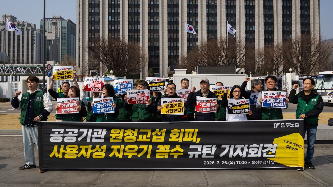 서울 정부청사 앞에서 열린 '공공기관 원청교섭 회피, 사용자성지우기 꼼수 규탄 기자회견'에 참가했습니다.
