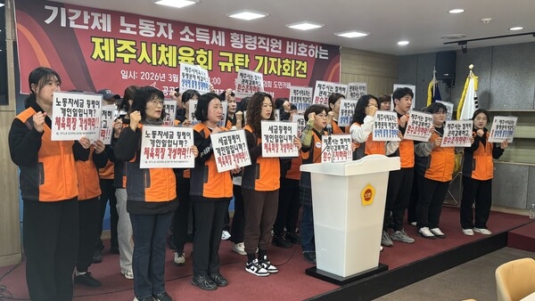제주본부는 제주시의회에서 '기간제 노동자 소득세 횡령직원 비호하는 제주시체육회 규탄 기자회견'을 진행했습니다.