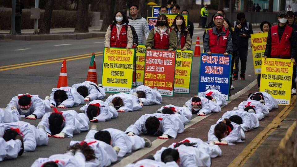 우창코넥타지회는 서울 청와대 앞에서 모베이스 규탄 및 고용승계 등 실질적 대책 마련을 촉구하며 오체투지를 진행했습니다.