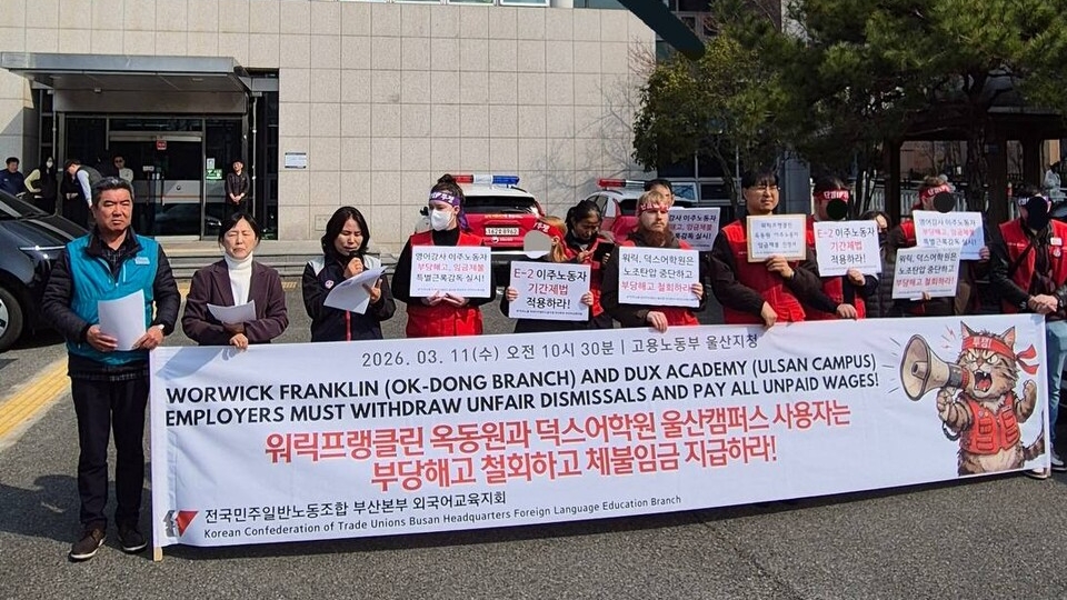 부산본부 외국어교육지회는 고용노동부 울산지청 앞에서 '워릭프랭클린 옥동원과 덕스어학원 울산캠퍼스 사용자는 부당해고 철회하고 체불임금 지급하라' 기자회견을 진행했습니다.