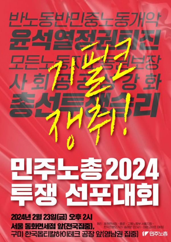 2024 민주노총 투쟁 선포대회 작성자 정보 최고관리자 작성 작성일 2024.02.15 15:38 컨텐츠 정보 4,806 조회 목록 본문 2024 민주노총 투쟁 선포대회2.23(금) 14시- 서울 (세종대로 동화면세점 앞) - 구미 (한국옵티칼하이테크 공장 앞)반노동 반민중 노동개악 윤 석 열 정 권 퇴 진모든 노동자 노동권 보장 사회공공성 강화!한국옵티칼하이테크 투쟁승리! 총 선 투 쟁 승 리____________좌(서울) 우(구미)대회 안내 웹자보 배포 바랍니다. [이 게시물은 최고관리자님에 의해 2024-03-06 09:51:45 연맹소식에서 이동 됨] 관련자료 이전 [카드뉴스] 2024년 3월 9일 윤석열 정권 출범 2년째 그동안 대한민국은... 작성일 2024.03.06 10:07 다음 [카드뉴스] 여야 야합 중대재해처벌법 개악 저지! 중대재해처벌법은 이미 시행 중 작성일 2024.02.01 12:51 댓글 0 등록된 댓글이 없습니다. 로그인한 회원만 댓글 등록이 가능합니다. 목록
