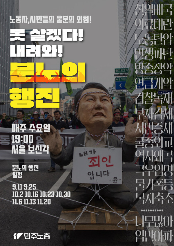 [안내] 못라겠다 내려와! 분노의 행진 작성자 정보 최고관리자 작성 작성일 2024.09.10 09:52 컨텐츠 정보 3,125 조회 목록 본문 윤석열정권 퇴진을 향한노동자, 시민의 울분의 외침!못 살겠다! 내려와!분노의 행진 매주 수요일 19:00서울 보신각 *분노의 행진 일정9.11, 9.2510.2, 10.16, 10.23, 10.3011.13, 11.20 관련자료 이전 윤석열정권 OUT! 불평등 한국사회 OUT! 한국사회대전환 페스티벌 작성일 2024.09.30 16:04 다음 [안내] 2024 민주노총 정책대회-현장토론 진행 작성일 2024.09.05 10:30 댓글 0 등록된 댓글이 없습니다. 로그인한 회원만 댓글 등록이 가능합니다. 목록